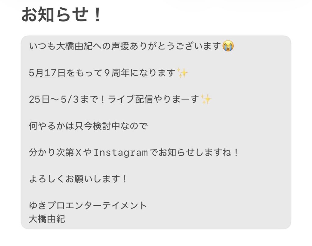 2026.04.21 お知らせ 【お知らせ】大橋由紀からのお知らせ! SHARE X Facebook ← PREV【お知らせ】プラスパワーホールディングス代表取締役社長 異動に関するご案内 お知らせ一覧に戻る